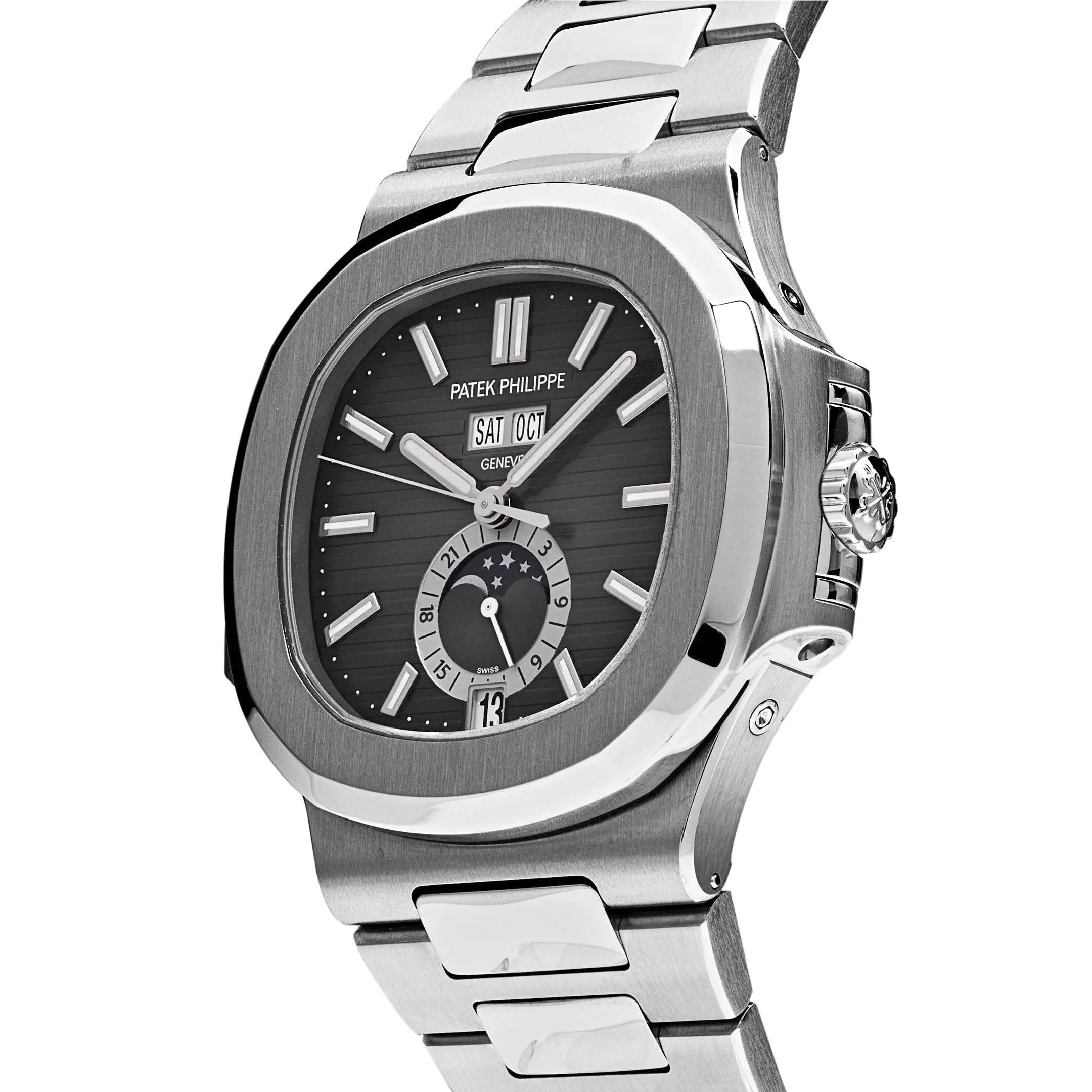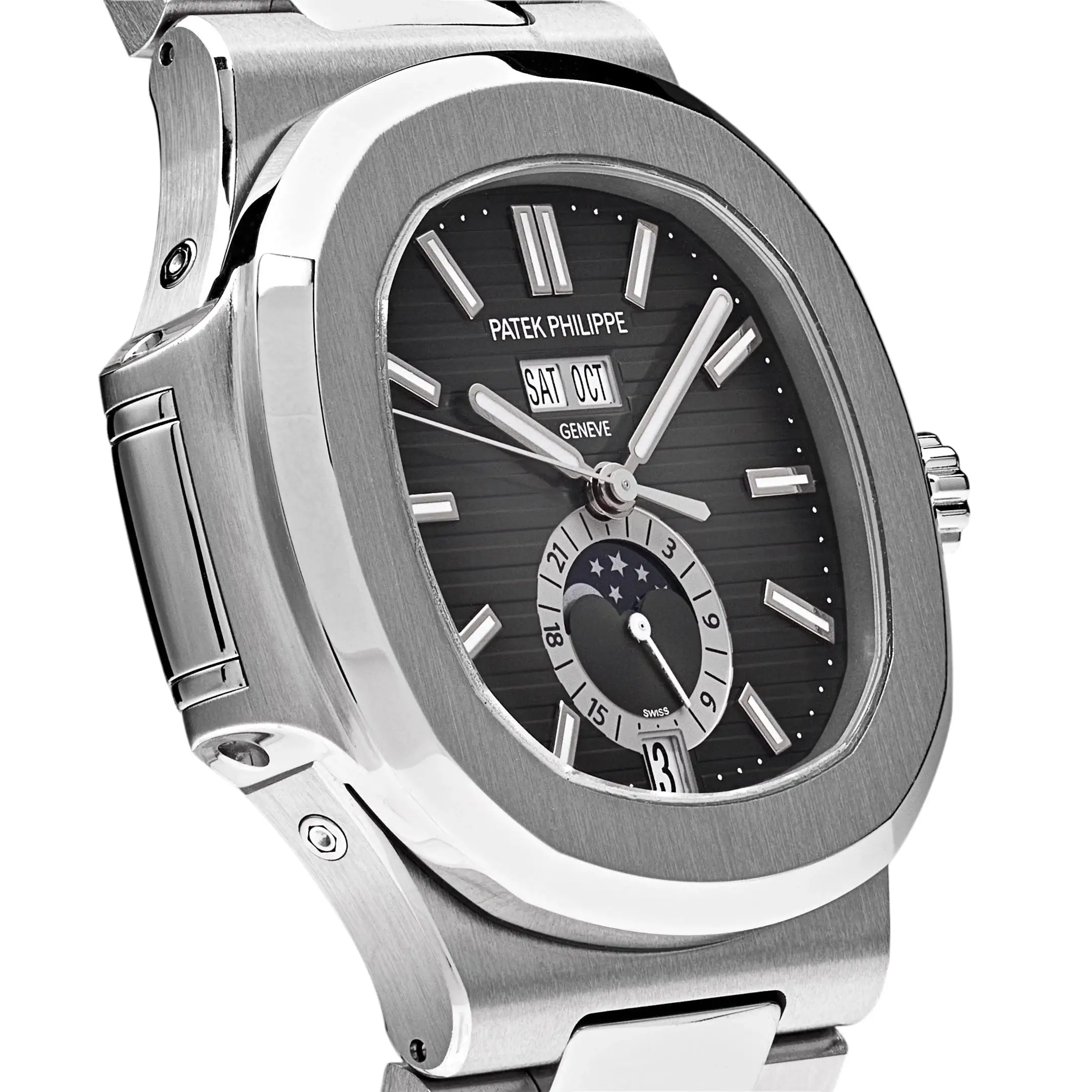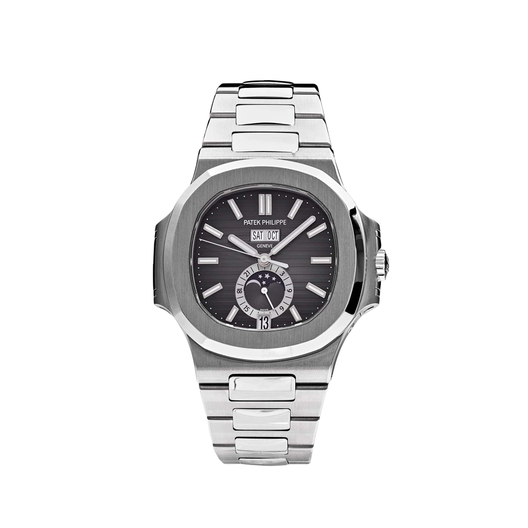 Its annual calendar displays the day, date, and month at the top of the dial, while the moon phase and 24-hour subdial sit elegantly at 6 o’clock. White gold markers and luminescent hands ensure legibility in all conditions. Paired with an integrated stainless steel bracelet, the 5726/1A-001 is a versatile masterpiece—uniting technical innovation with timeless Nautilus style.