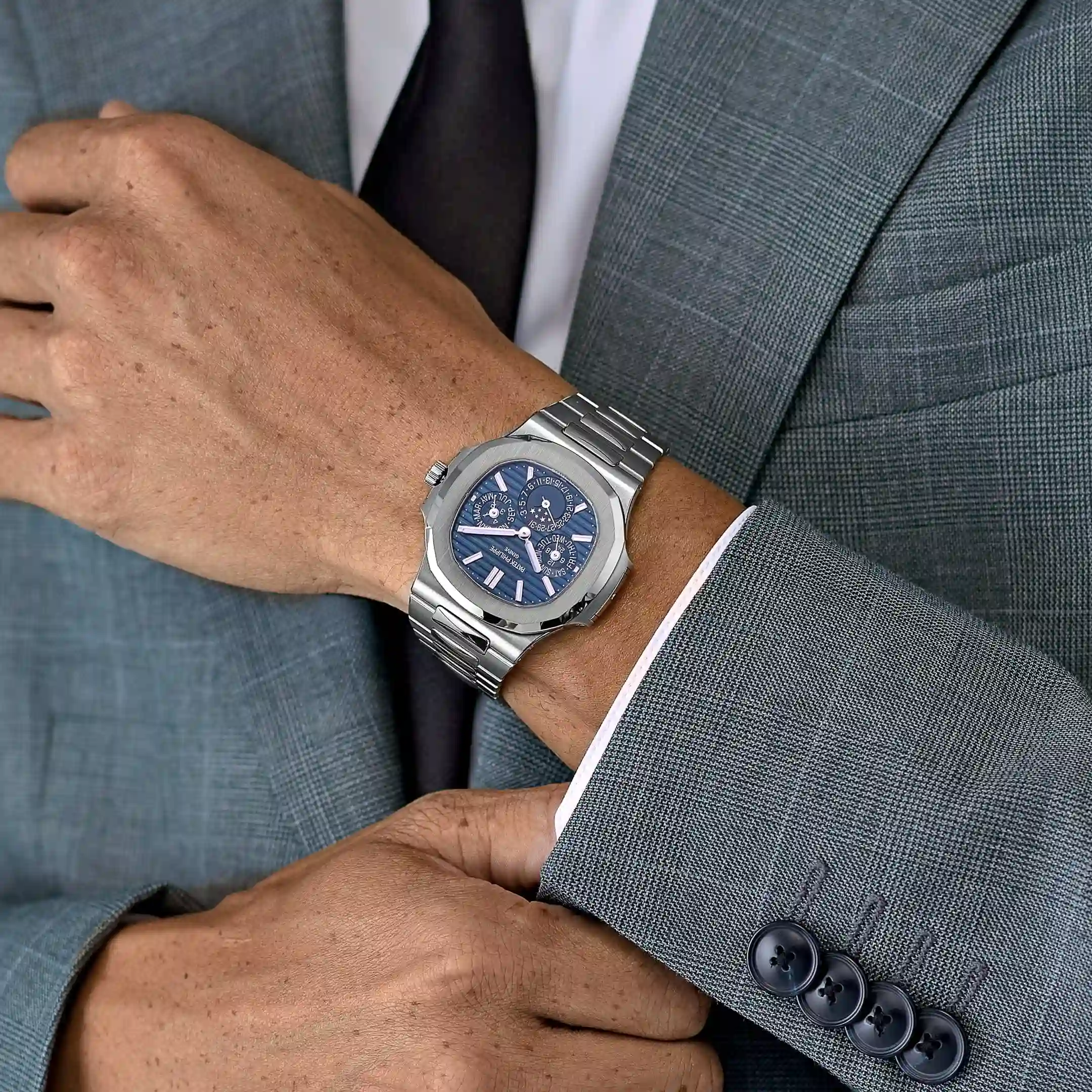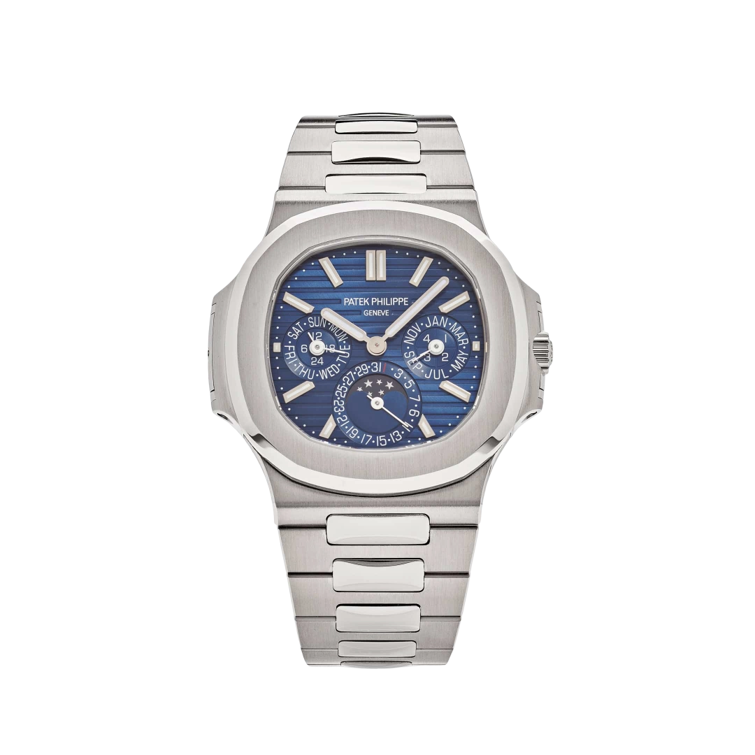 The Nautilus 5740/1G-001 is the ultimate fusion of sportiness and high complication, crafted in 40mm case and integrated bracelet. Its blue sunburst dial hosts a beautifully arranged perpetual calendar, displaying day, date, month, leap year, and moon phases across three subdials.