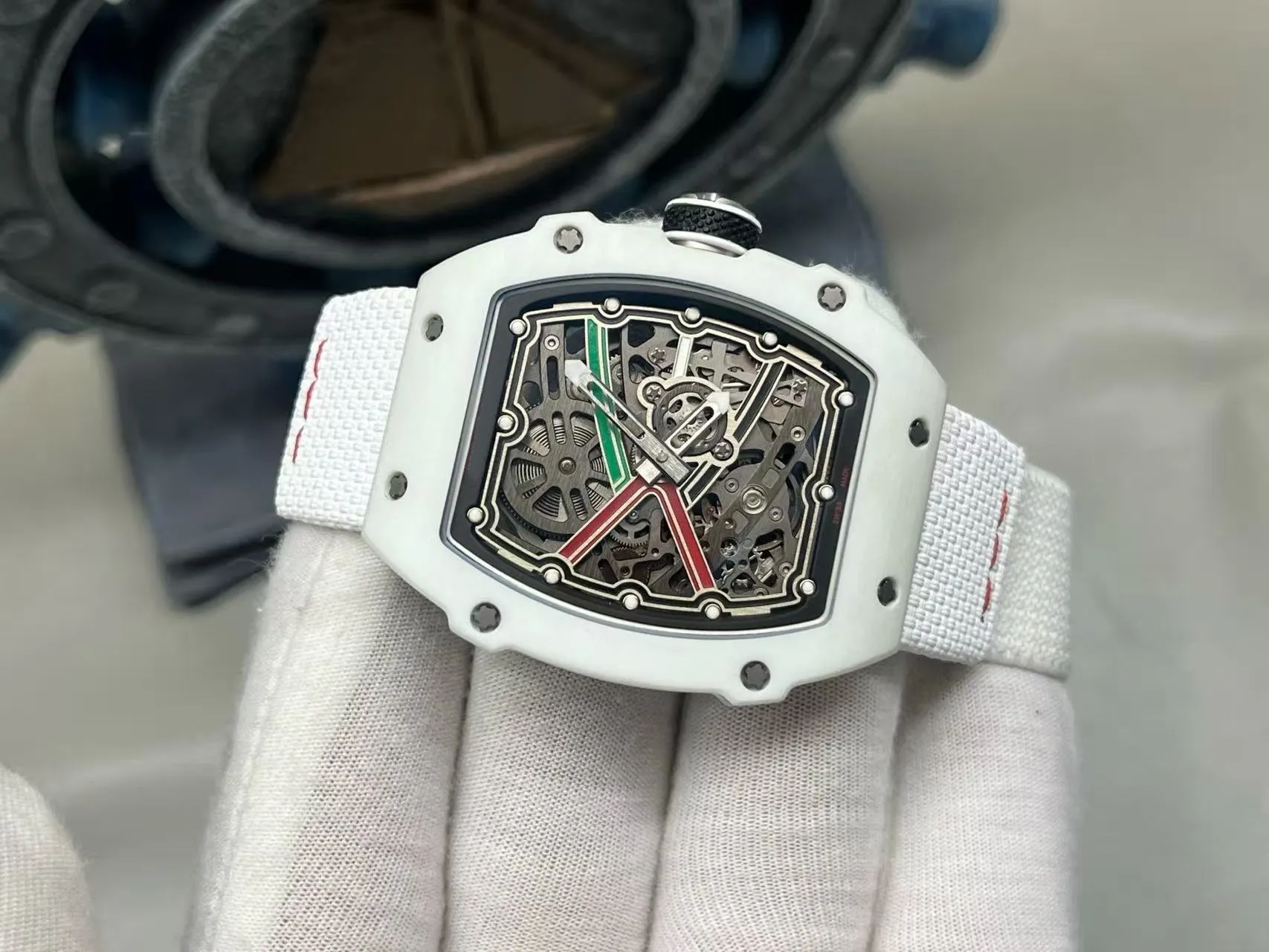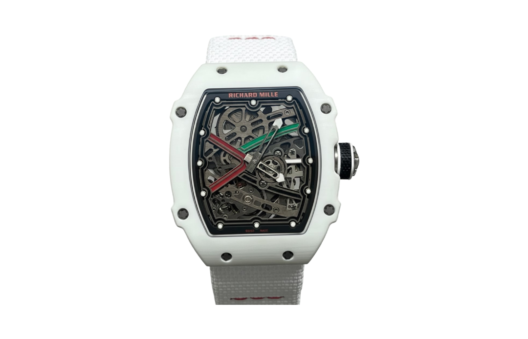 A premium custom replica clone of the Richard Mille RM 67-02 Automatic Extra Flat, designed as a UAE (United Arab Emirates) tribute edition with a pristine white NTPT carbon fiber case and matching white elastic strap for an elegant, monochromatic aesthetic. The skeleton dial features custom accents inspired by the UAE flag. This ultra-lightweight sports watch measures 39mm x 7.8mm (identical to the genuine for superior ergonomics and featherlight comfort), featuring a white NTPT (North Thin Ply Technology) composite case with the iconic layered woven pattern that ensures exceptional strength and minimal weight—closely replicating the original's impressive ~34g total mass. Powered by an Asian modified clone of the CRMA7 skeletonized automatic movement, it delivers precise hours and minutes display through a fully openworked skeleton dial that showcases the intricate mechanics. Equipped with a curved scratch-proof sapphire crystal with AR coating for flawless visibility, and completed with a seamless white elastic fabric strap (Ventile-style, highly breathable, quick-drying, and ultra-flexible) that enhances the luxurious, high-performance feel. This clone beautifully captures the avant-garde sophistication, extreme lightness, and national pride theme common in RM's bespoke athlete/national editions at an accessible price.