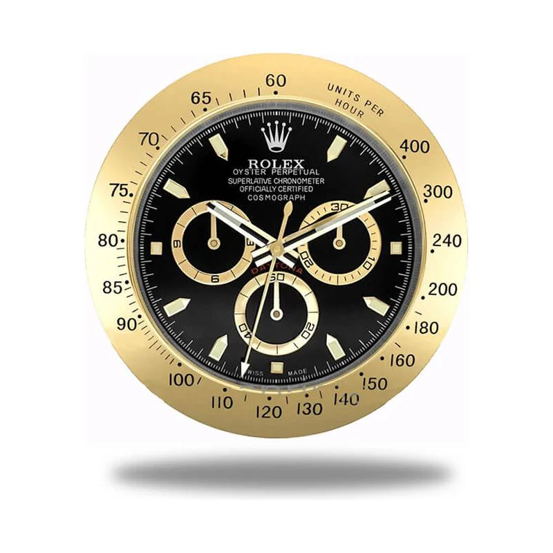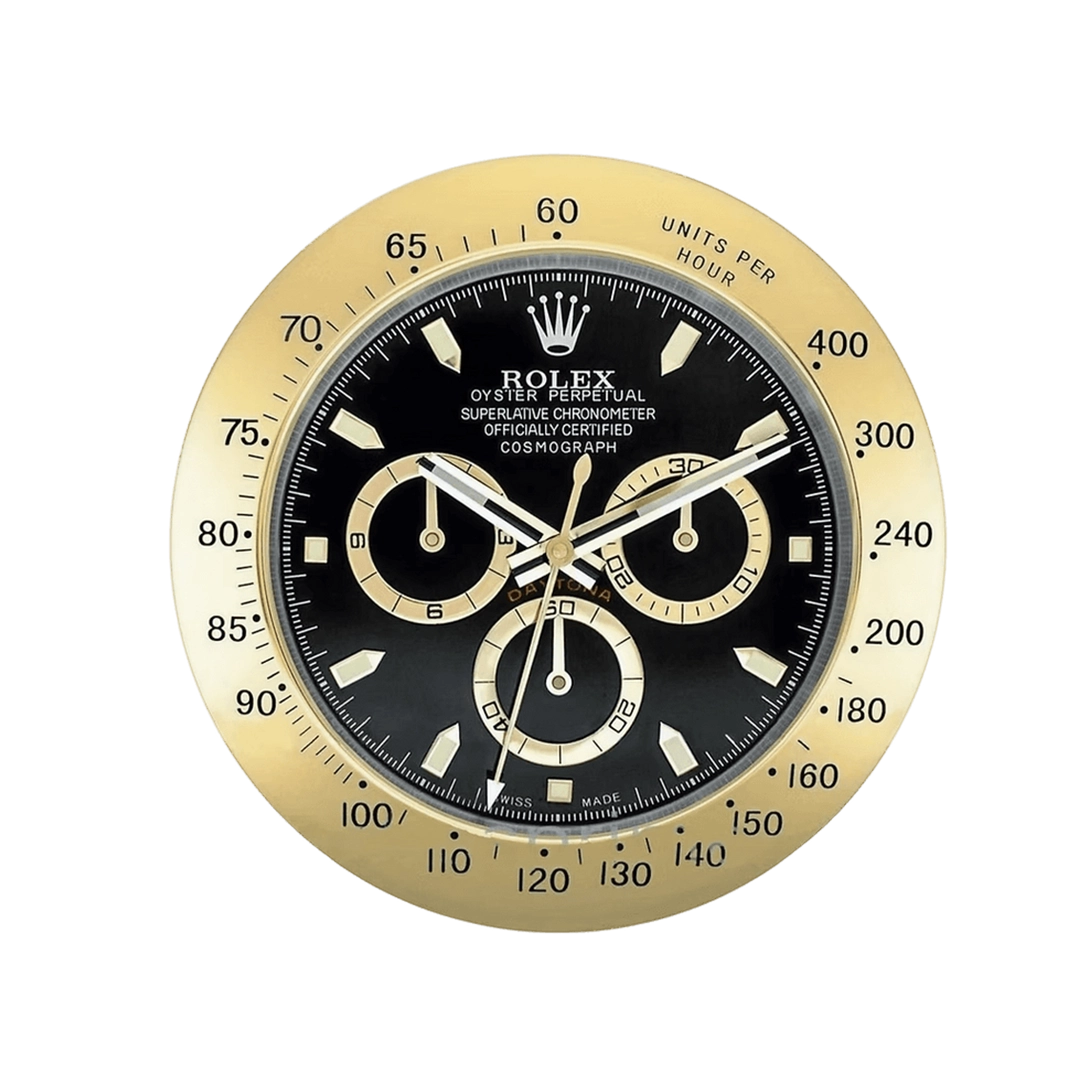 The Rolex Daytona Gold & Black Dial Wall Clock is a luxurious homage to the legendary Cosmograph Daytona in its opulent gold and black configuration. With a diameter of approximately 34 cm and a slim depth of only 5 cm, it features a polished gold-tone case and fixed tachymeter-engraved bezel that embody Rolex's iconic racing heritage. The deep black dial showcases contrasting champagne subdials, applied luminous gold hour markers, and signature chronograph hands for a refined, high-contrast aesthetic. Powered by a sweeping quartz movement and a single AA battery, it ensures silent and precise timekeeping. This exquisite decorative piece brings the timeless prestige and motorsport spirit of Rolex into any home, office, or collection space, blending practical functionality with bold luxury appeal. Ideal for enthusiasts who admire the enduring style of one of the world's most coveted chronographs.