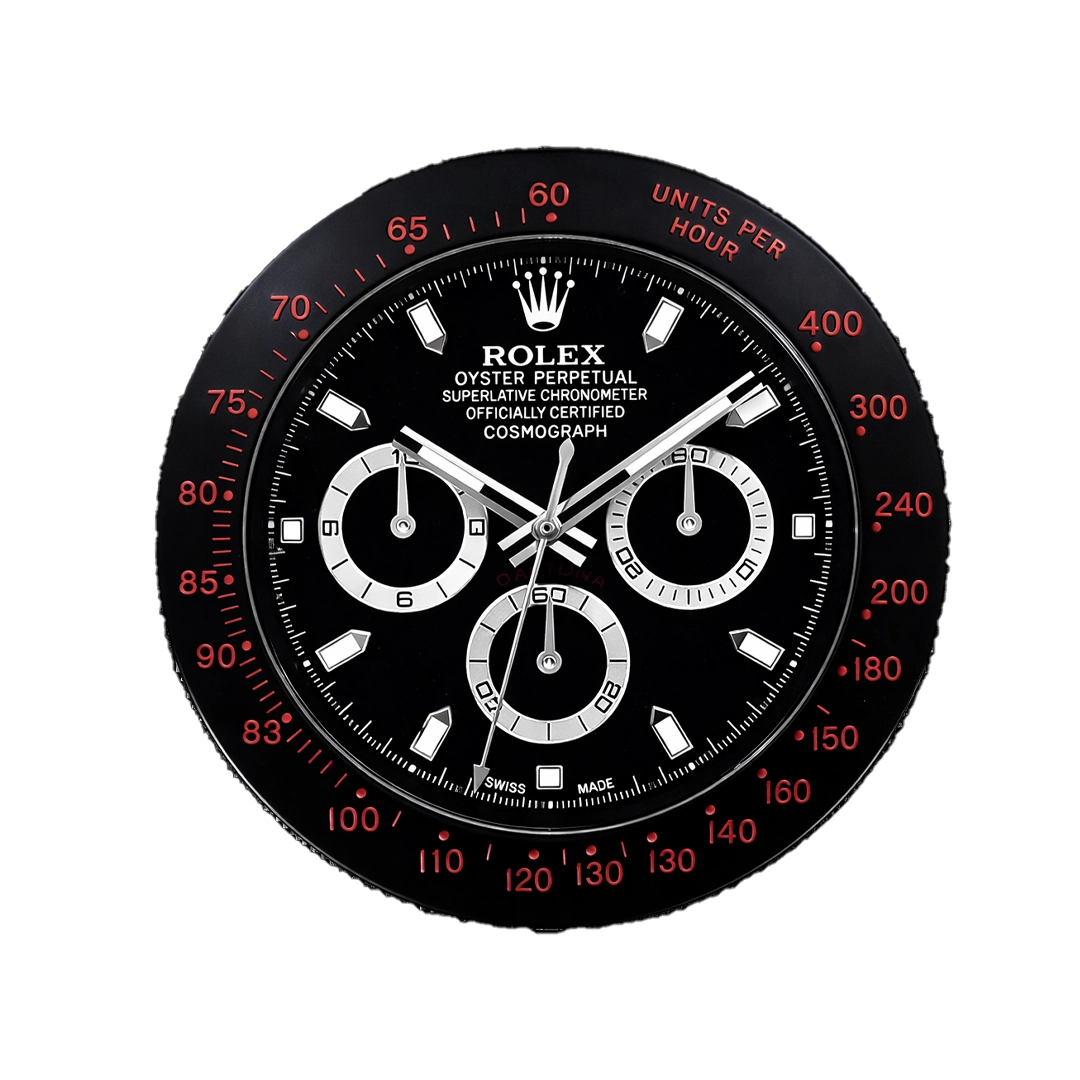 The Rolex Daytona Noir Rouge Wall Clock is a dramatic homage to the legendary Cosmograph Daytona with its sophisticated black and red "Noir Rouge" color scheme. With a diameter of approximately 34 cm and a slim depth of only 5 cm, it features a polished stainless steel case and fixed tachymeter-engraved bezel that embody Rolex's iconic racing heritage. The deep black dial showcases contrasting red subdials and accents, applied luminous hour markers, and signature chronograph hands for a bold, high-contrast vintage-inspired aesthetic. Powered by a sweeping quartz movement and a single AA battery, it ensures silent and precise timekeeping. This striking decorative piece brings the timeless prestige and motorsport spirit of Rolex into any home, office, or collection space, blending practical functionality with unmistakable luxury appeal. Ideal for enthusiasts who admire the enduring style of one of the world's most coveted chronographs.