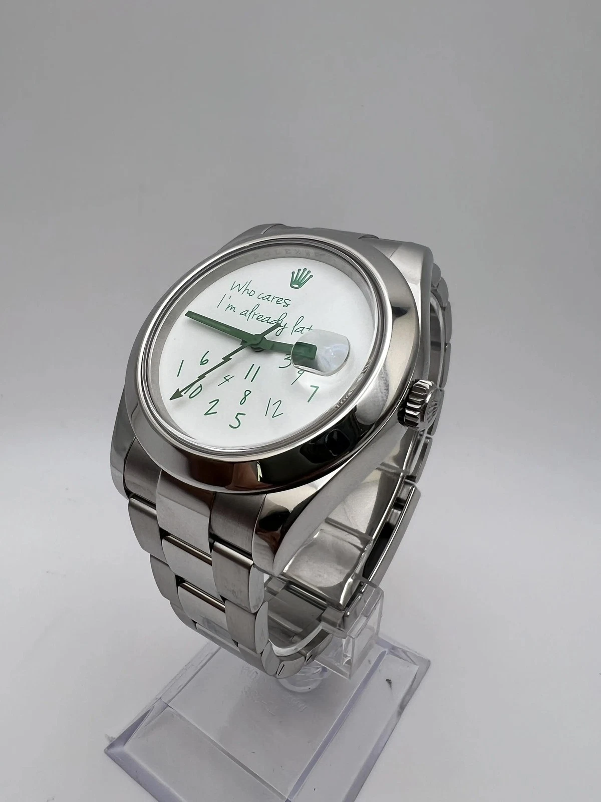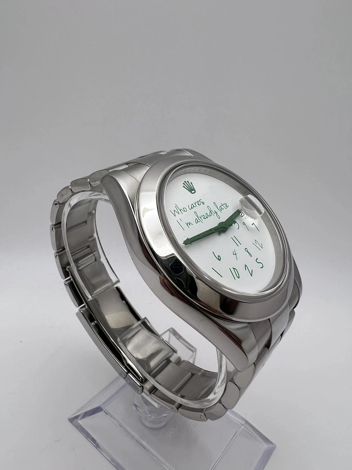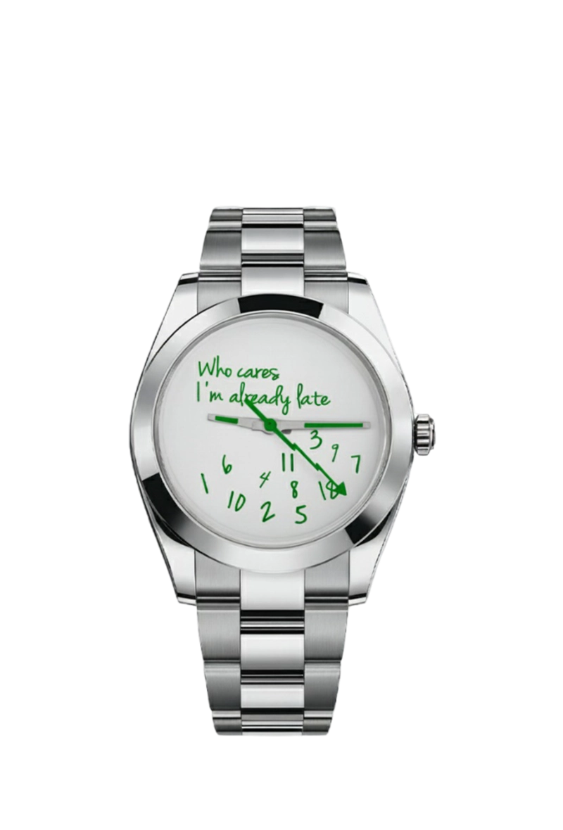 The Rolex Milgauss “Who Cares I’m Already Late” is a playful, custom-inspired take on the iconic anti-magnetic watch. Housed in a robust 40mm Oystersteel case with smooth bezel, it features a vivid green dial with the humorous “Who Cares I’m Already Late” text boldly printed across the center, paired with luminous lightning-bolt seconds hand for a signature look. The orange Arabic numerals and hour markers pop against the green background, ensuring excellent legibility in any light. It delivers exceptional precision. The classic Oyster bracelet with Oysterclasp offers comfort and durability. A fun, irreverent twist on Rolex engineering, this piece is perfect for those who appreciate bold personality, technical excellence, and a touch of cheeky attitude in their everyday watch.