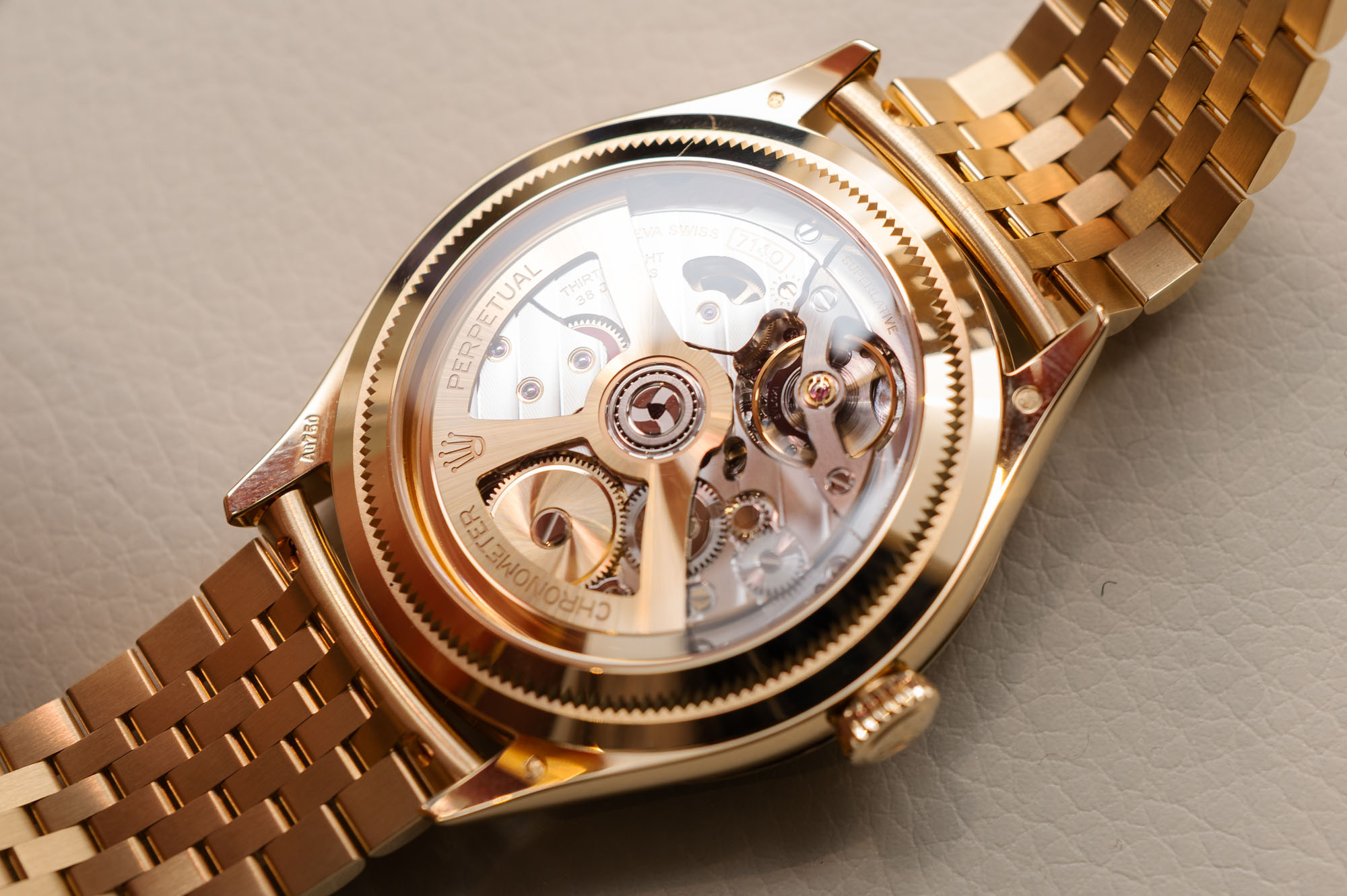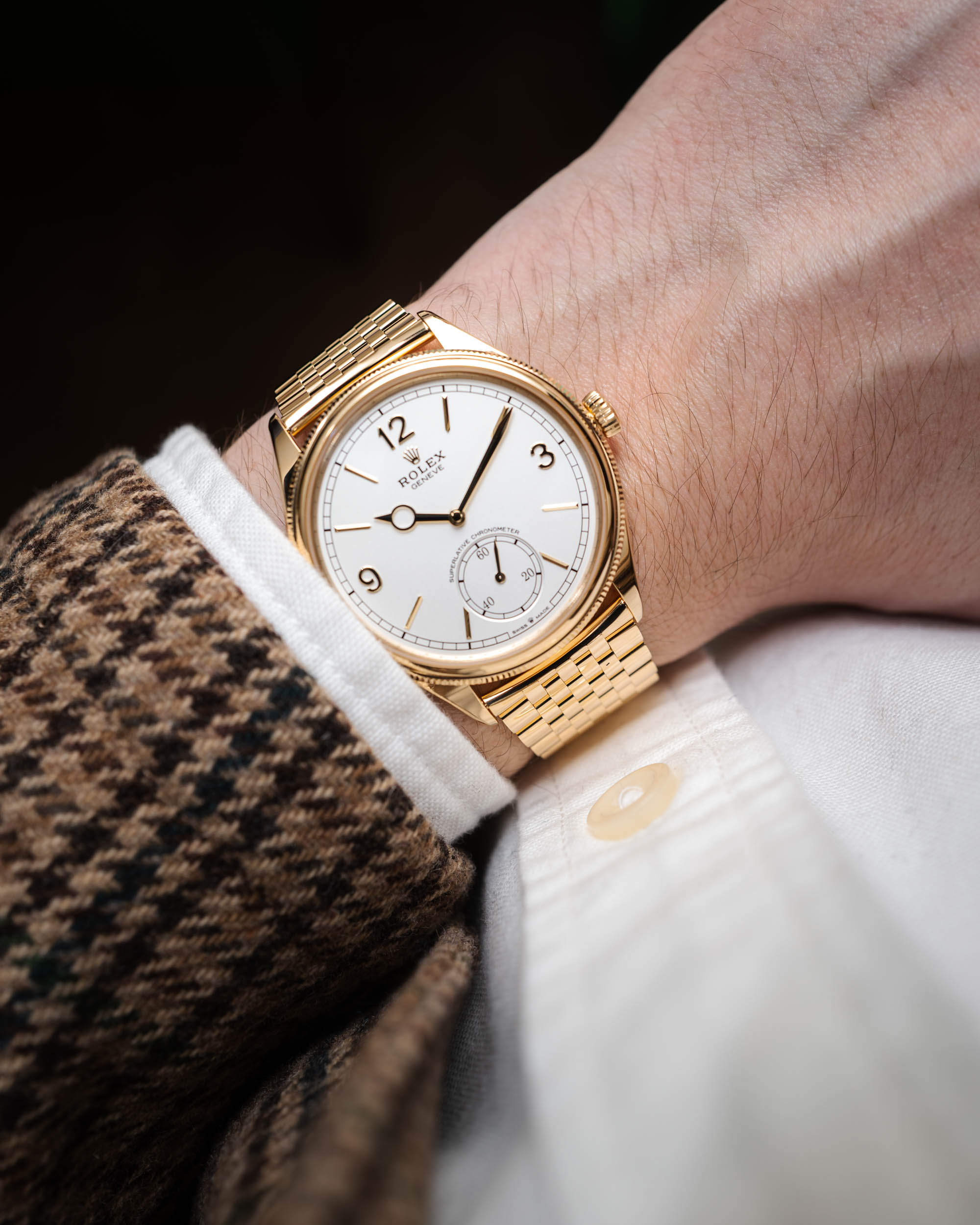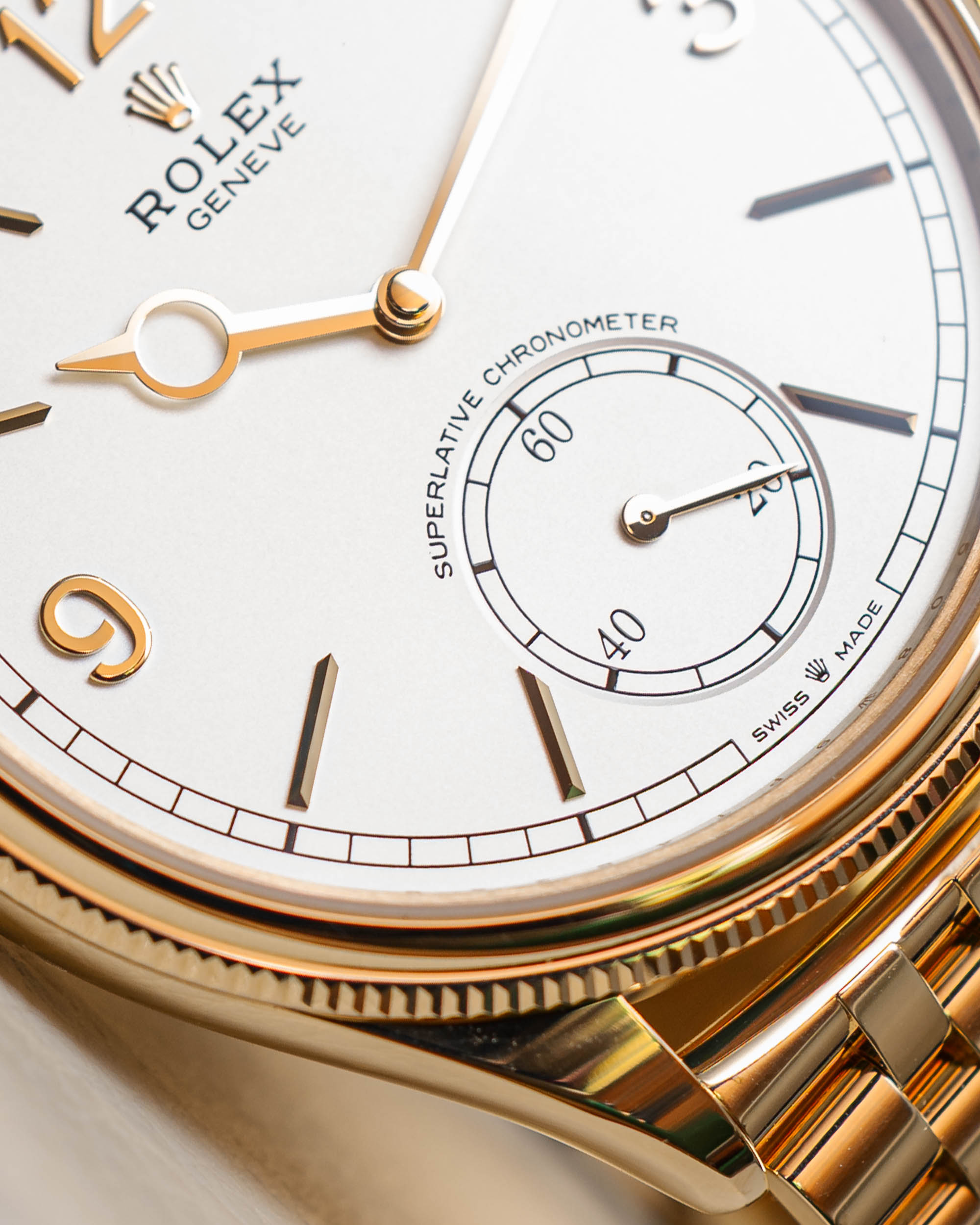 The intense white dial is crisp and sophisticated, showcasing applied gold Arabic numerals at 3, 9, and 12 o’clock, slender hour markers, and a small seconds subdial positioned at 6 o’clock for perfect visual balance. Powered by a high-precision manual-winding movement with a 66-hour power reserve, the watch meets Rolex’s Superlative Chronometer standards and reveals its exquisite craftsmanship through a transparent sapphire caseback.