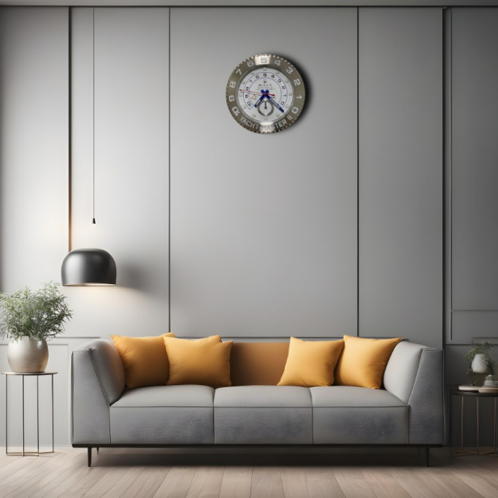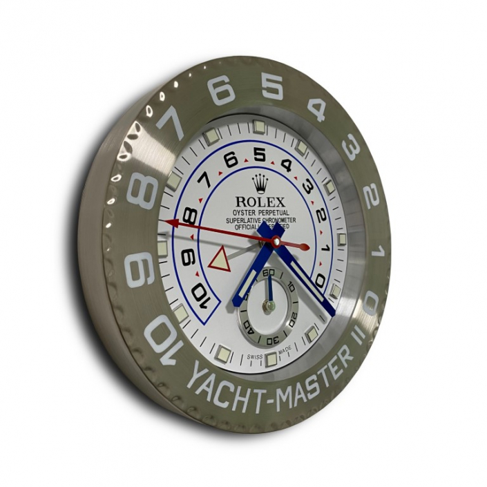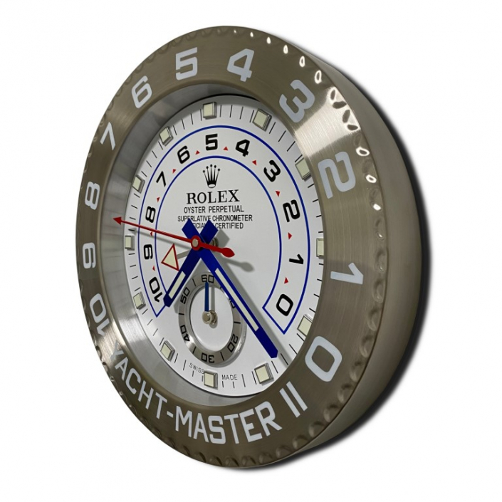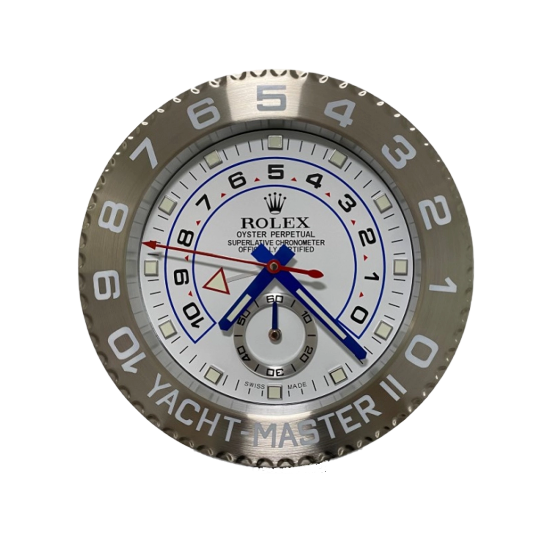 The Rolex Yacht-Master II White Dial Wall Clock is a striking tribute to the professional regatta chronograph. With a diameter of approximately 34 cm and a slim depth of only 5 cm, it features a polished stainless steel case and Silver Cerachrom bezel with platinum-coated 10-minute countdown numerals for an authentic yacht-racing aesthetic. The pristine white dial showcases bold blue accents, luminous hands, red countdown arrow, and programmable regatta subdials for a dynamic, high-legibility look. Powered by a sweeping quartz movement and a single AA battery, it ensures silent and precise timekeeping. This elegant decorative piece brings the timeless prestige and nautical heritage of Rolex into any home, office, or collection space, blending practical functionality with bold luxury appeal. Ideal for enthusiasts who admire the technical sophistication of one of Rolex's most distinctive models.