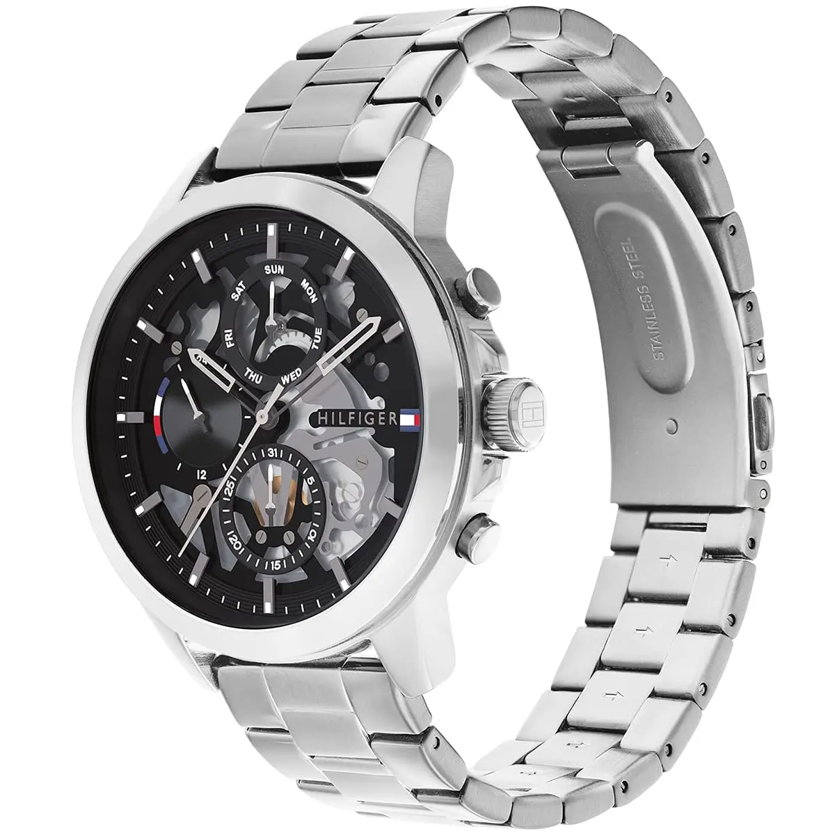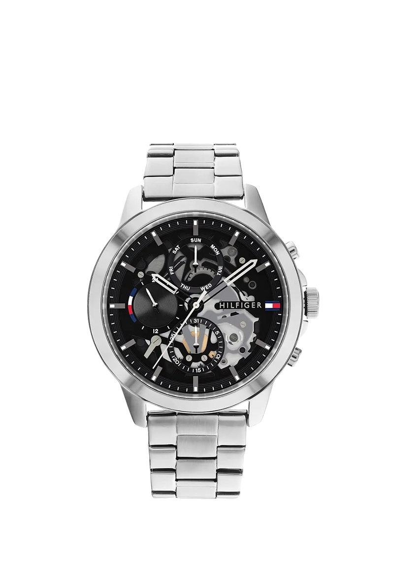 The Tommy Hilfiger Henry 1710477 is a classic men's three-hand watch that captures the brand's iconic American preppy style with modern simplicity. Housed in a polished 44mm round stainless steel case with an 11mm thickness, its sleek black dial features luminous hands and applied indices for excellent legibility, complemented by monthly and weekly date displays for practical functionality. The silver stainless steel bracelet with 21mm width offers a premium, comfortable fit at 132 grams. Powered by reliable quartz movement, it ensures precise timekeeping and 50 meters water resistance. Designed with Tommy Hilfiger's signature clean aesthetic, this analog timepiece exudes effortless sophistication and versatility, making it an ideal everyday essential for the contemporary man who appreciates durable craftsmanship, timeless design, and subtle elegance.