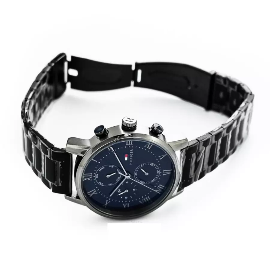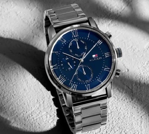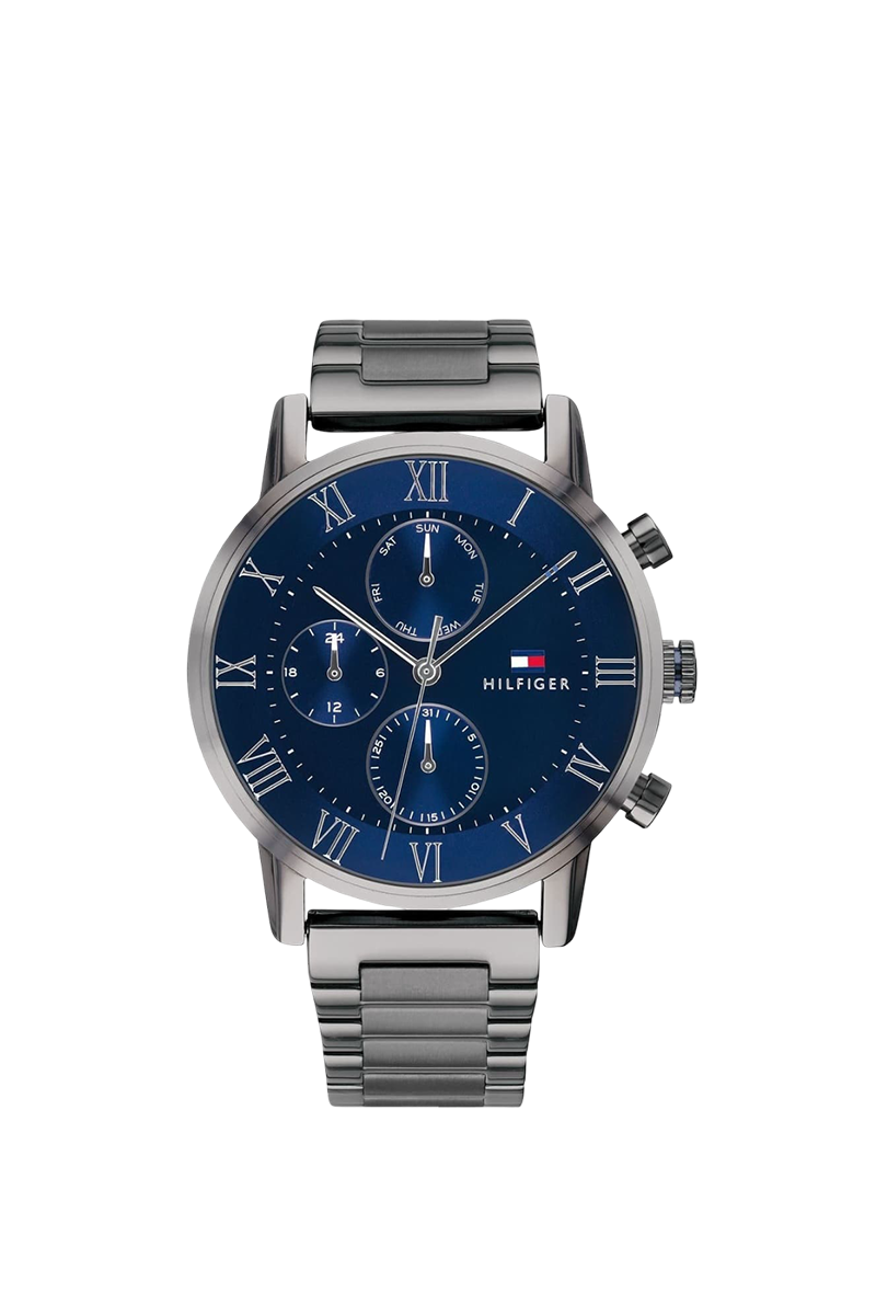 The Tommy Hilfiger Kane 1791456 is a modern men's watch that embodies the brand's signature American preppy style with contemporary flair. Housed in a polished 44mm round stainless steel case with an 11mm thickness, its captivating blue dial features luminous hands and applied indices for excellent legibility, along with monthly and weekly date displays for added practicality. The grey stainless steel bracelet with 22mm width offers a sleek, comfortable fit. Powered by reliable quartz movement, it ensures precise timekeeping and 30 meters water resistance. Designed with Tommy Hilfiger's clean and versatile aesthetic, this analog timepiece exudes effortless sophistication, making it an ideal everyday accessory for the stylish man who appreciates durable craftsmanship, bold color, and timeless appeal in a reliable daily watch.
