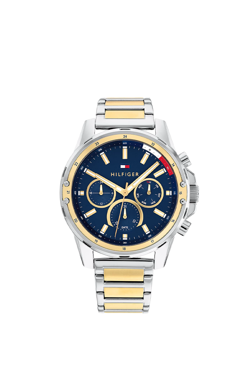 The Tommy Hilfiger Mason 1791937 is a luxurious men's watch that embodies the brand's classic American preppy style with elegant two-tone detailing. Housed in a polished 44mm round stainless steel case with an 11mm thickness, its captivating blue dial features luminous hands and applied indices for excellent legibility, along with monthly and weekly date displays for added practicality. The two-tone silver and gold stainless steel bracelet with 21mm width offers a premium, comfortable fit. Powered by reliable quartz movement, it ensures precise timekeeping and 50 meters water resistance. Designed with Tommy Hilfiger's signature refined aesthetic, this analog timepiece exudes effortless sophistication and versatility, making it an ideal everyday accessory for the modern man who appreciates durable craftsmanship and timeless appeal.