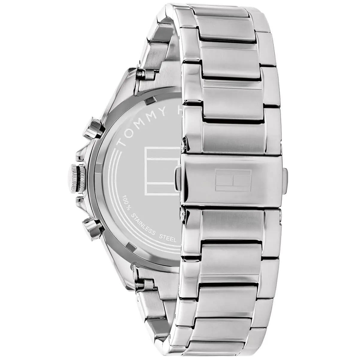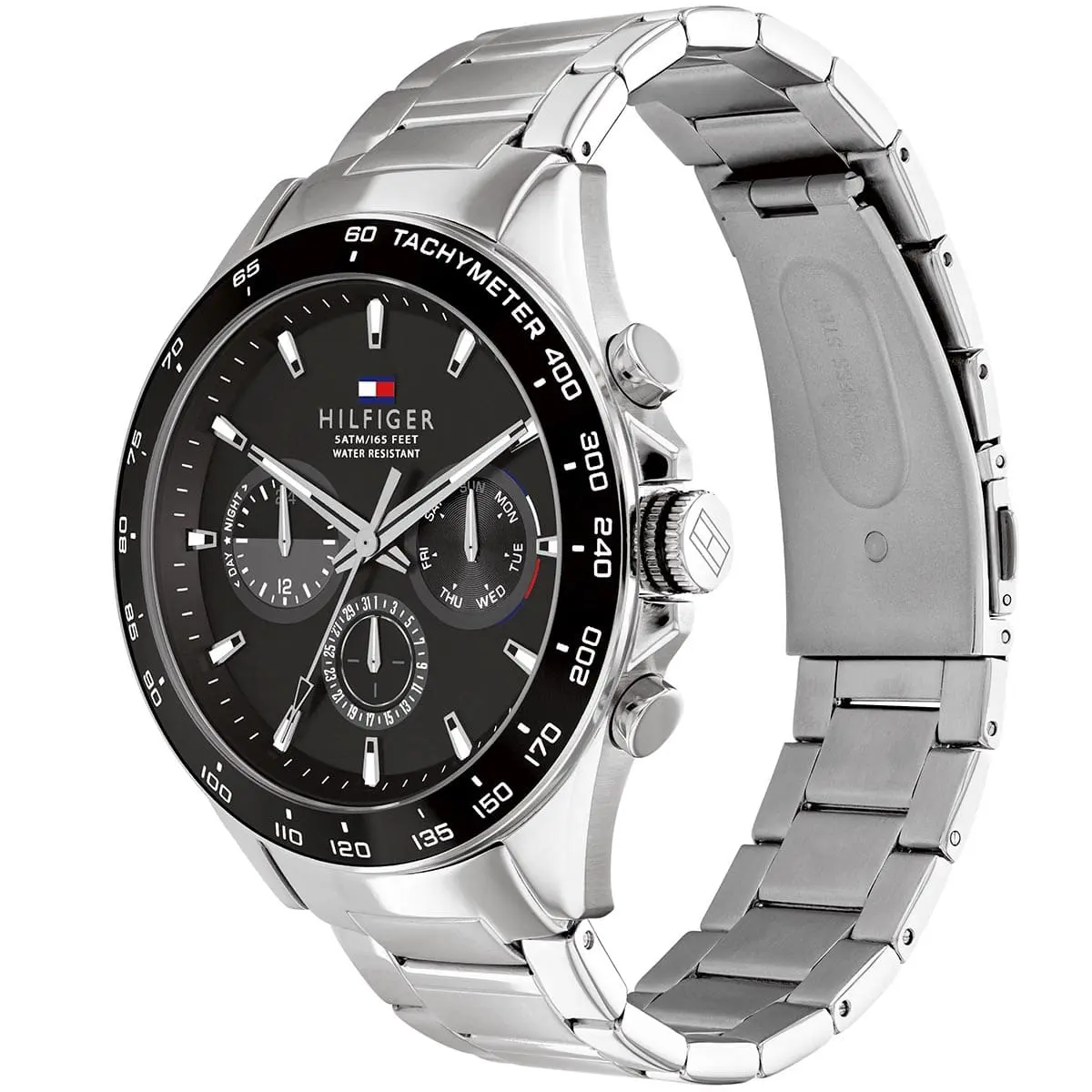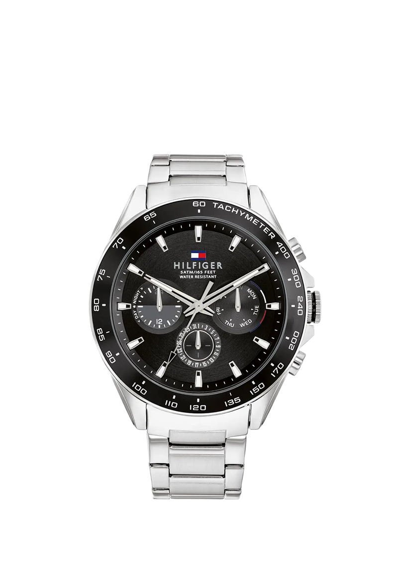 The Tommy Hilfiger Owen 1791967 is a bold men's chronograph that combines classic American preppy style with sporty functionality. Housed in a substantial 46mm round stainless steel case with an 11mm thickness, its intense black dial features luminous hands and applied indices for excellent legibility, complemented by chronograph subdials, monthly and weekly date displays, and stopwatch capability. The silver stainless steel bracelet with 22mm width offers a premium, comfortable fit at 145 grams. Powered by reliable quartz movement, it ensures precise performance and 50 meters water resistance. Designed with Tommy Hilfiger's signature refined aesthetic, this analog timepiece exudes effortless sophistication and versatility, making it an ideal everyday watch for the modern man who appreciates durable craftsmanship, bold design, and timeless appeal.