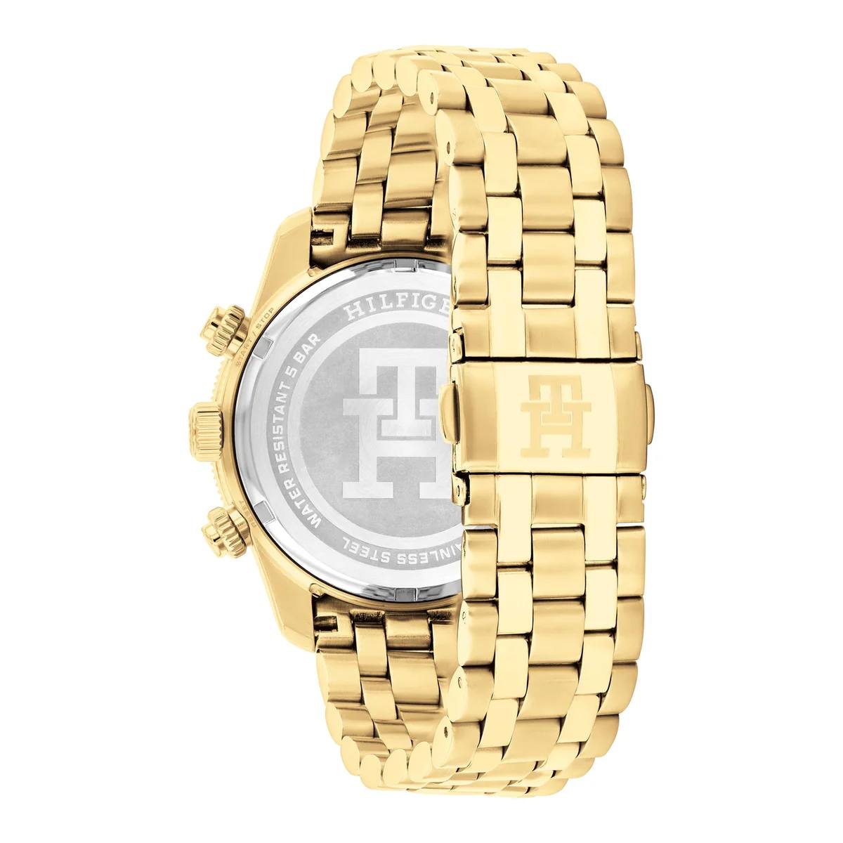 The Tommy Hilfiger TH85 1792158 is a captivating men's chronograph that radiates the brand's iconic American preppy charm with lavish gold accents. Encased in a polished 41mm round stainless steel body with a 12mm profile, its mesmerizing deep blue dial glows with luminous hands and applied indices, delivering razor-sharp readability while chronograph subdials and a monthly date window add dynamic utility. The opulent gold stainless steel bracelet, 20mm wide, drapes the wrist in premium comfort at 139 grams. Driven by precise quartz movement, it offers flawless timing and 50 meters water resistance. Crafted with Tommy Hilfiger's bold yet refined signature, this analog masterpiece exudes confident sophistication and timeless allure—perfect for the modern gentleman craving durable luxury and standout presence.