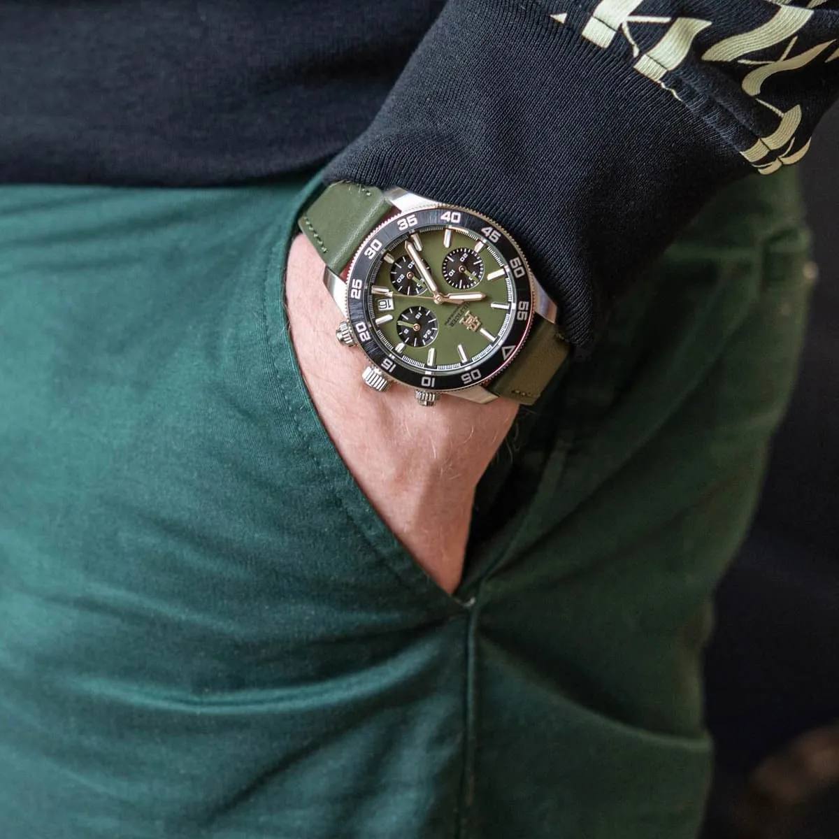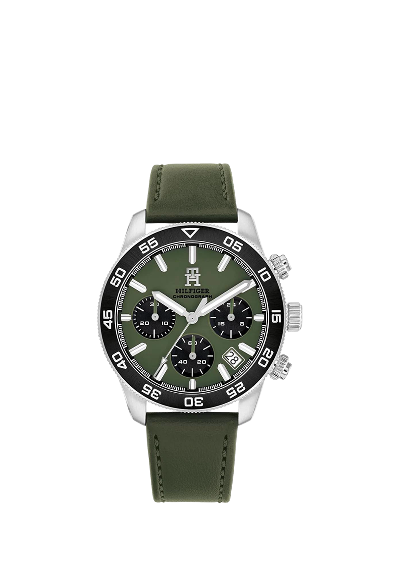 The Tommy Hilfiger TH85 1792188 is a captivating men's chronograph that radiates the brand's iconic American preppy charm with fresh green allure. Encased in a polished 41mm round stainless steel body with a 12mm profile, its vibrant green dial glows with luminous hands and applied indices, delivering razor-sharp readability while chronograph subdials and a monthly date window add dynamic utility. The genuine green leather strap, 20mm wide, drapes the wrist in supple comfort. Driven by precise quartz movement, it offers flawless timing and 50 meters water resistance. Crafted with Tommy Hilfiger's bold yet refined signature, this analog masterpiece exudes confident sophistication and timeless vibrancy—perfect for the modern gentleman craving lightweight luxury and standout presence.